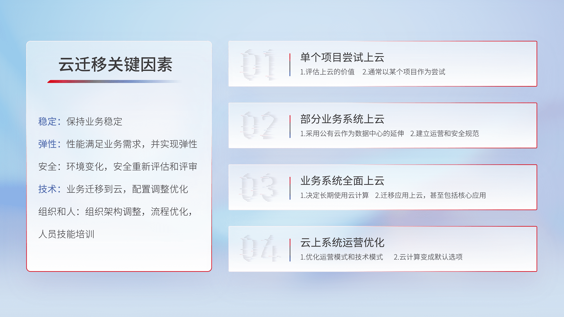 结合实际业务,,,从规划设计、、、、云平台选型、、、云原生改造、、、、数据迁移、、、集成交付,,,迁移全过程为客户识别最佳上云路径,,,做好风险识别管理,,设计网络架构、、身份权限、、、、安全审计合规、、、操作审计、、日志审计、、、、监控告警策略、、、多站点容灾设计等,,,,对云上基础设施进行整体规划,,,提升IT治理水平,,,,以满足弹性、、高可用、、、高性能的需求。。。。