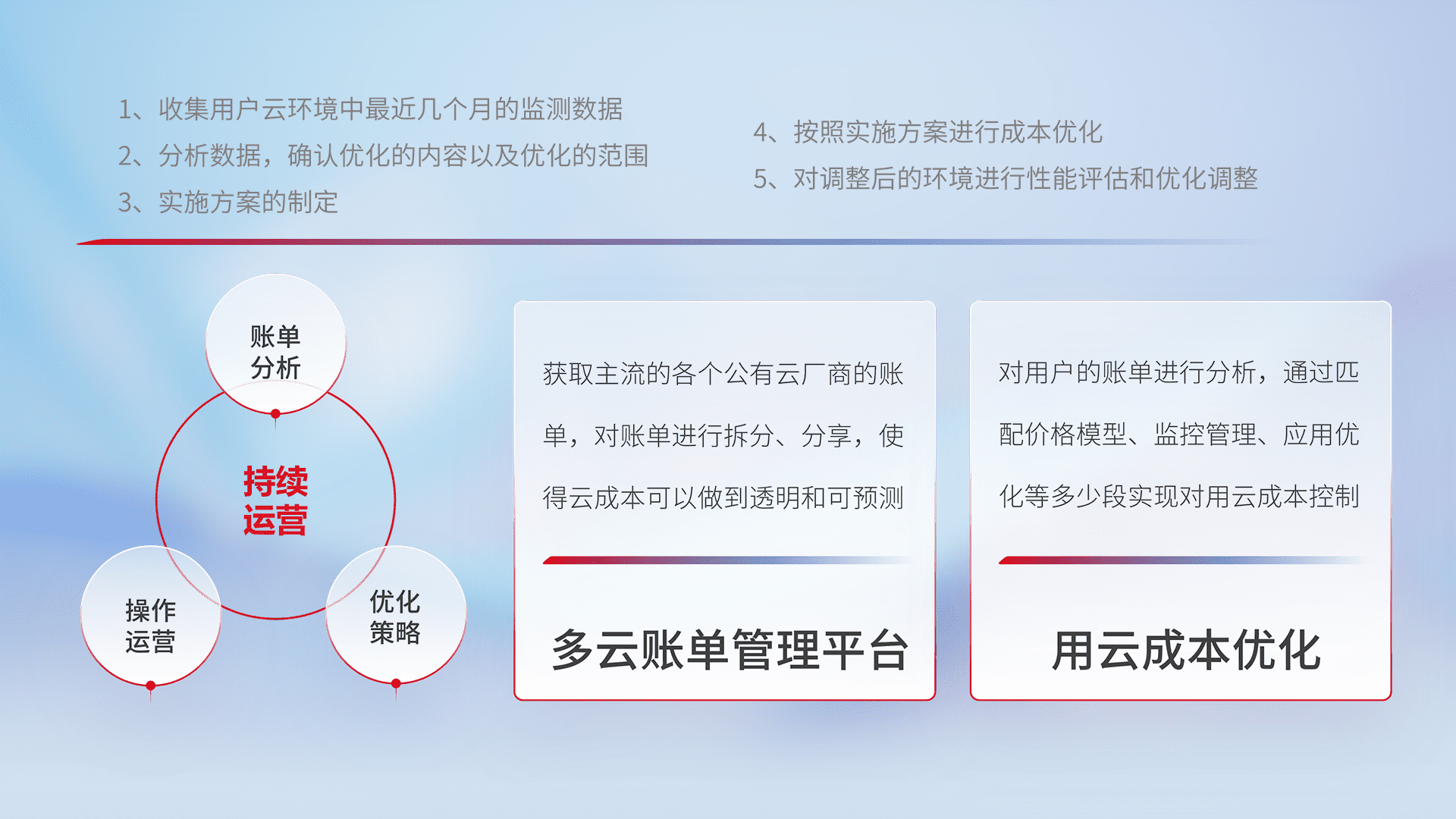 通过多云纳管,,,,以统一的资源数据模型把客户的云资源进行抽象和封装,,,进而实现对多云资源的统一操作,,保障云资源管理的可靠性、、、稳定性与可用性。。。量身定制化运维内容,,,,配置、、、、开发运维、、补丁管理、、、备份、、、、监控、、、认证和访问管理、、审计和日常巡检等,,保障在用云过程中的可靠度,,稳定度以及高可用率。。。